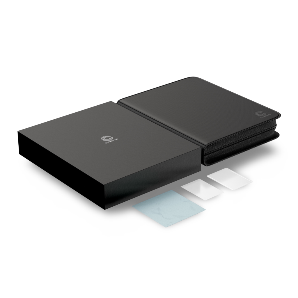 One of the product features is a care kit – Our binder includes essential accessories such as toploaders for maximum protection, ensuring your cards are shielded from bends, creases, and other potential damage. Penny sleeves to safeguard your cards against dust, fingerprints, and surface scratches, keeping them in pristine condition, and a microfiber cloth to keep your cards looking clean and sharp.